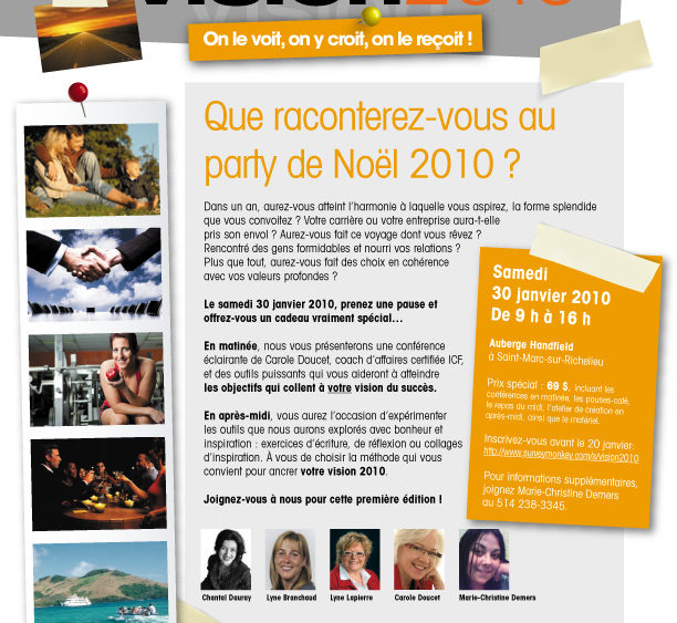 Avec une gang de filles allumées, j'organise la seconde édition de notre évènement Vision. Un après-midi pour faire le point sur vos objectifs de l'année, pour laisser monter l'inspiration, pour rêver mieux... Au menu: conférences, présentation de méthodes pour planifier de façon intuitive ou organisée, atelier de travail, échanges, goûter,... en lire plus →